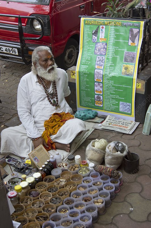 Man selling traditional Indian Ayurvedic medicine on a streets, Ayurvedic medicine is a form of alternative medicine which dates back to 5000BCE.